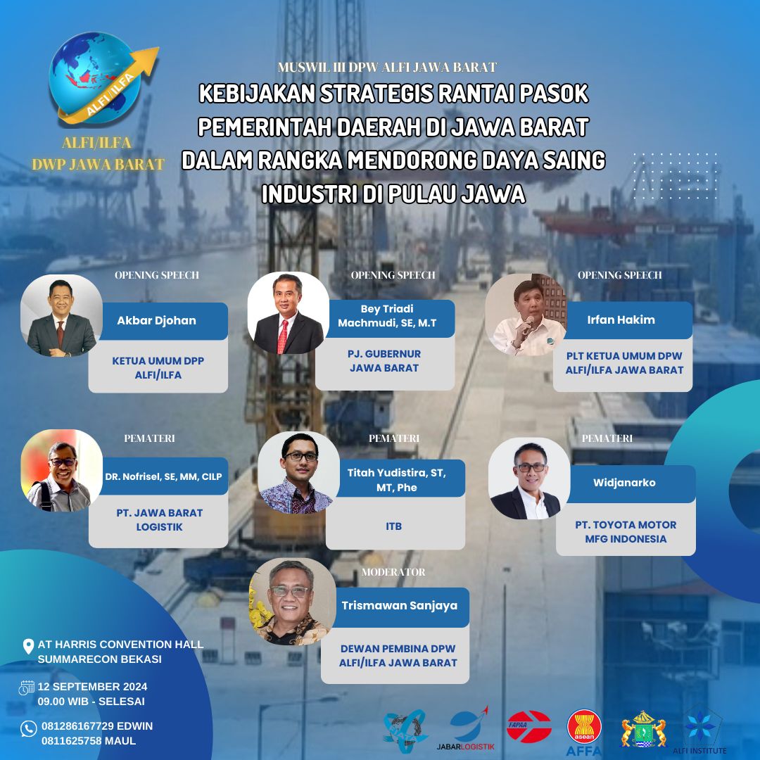 Muswil ALFI Jabar tahun 2024 dan Diskusi yang akan dilaksanakan pada Kamis, 12 September 2024 itu akan menghadirkan pembicara kunci antara lain: Ketua Umum DPP ALFI Akbar Djohan, Pejabat Gubernur Jawa Barat Bey Triadi Machmudi, dan Ketua ALFI Jawa Barat Irfan Hakim.