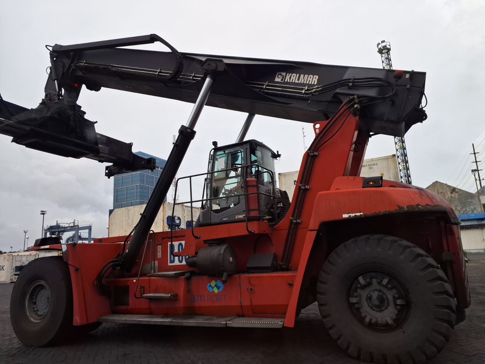 Manajemen Pengelola Container Yard Reefer MTI (eks depo Unggu) di Surabaya (photo atas). Satu unit alat bongkar muat reach stacker yang dioperasikan MTI di fasilitas Container Yard Reefer tersebut (photo bawah)-dok:Logistiknews.id/Akhmad Mabrori.