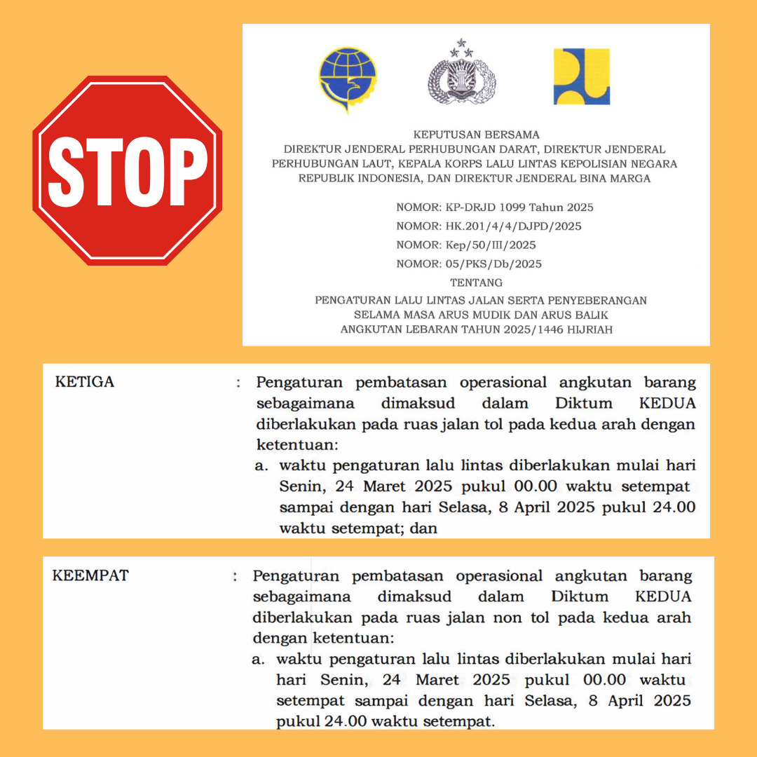 Dalam aturan tersebut, ditegaskan Pembatasan Angkutan Barang mulai sejak 24 Maret s/d 8 April 2025, atau sekitar dua pekan.
