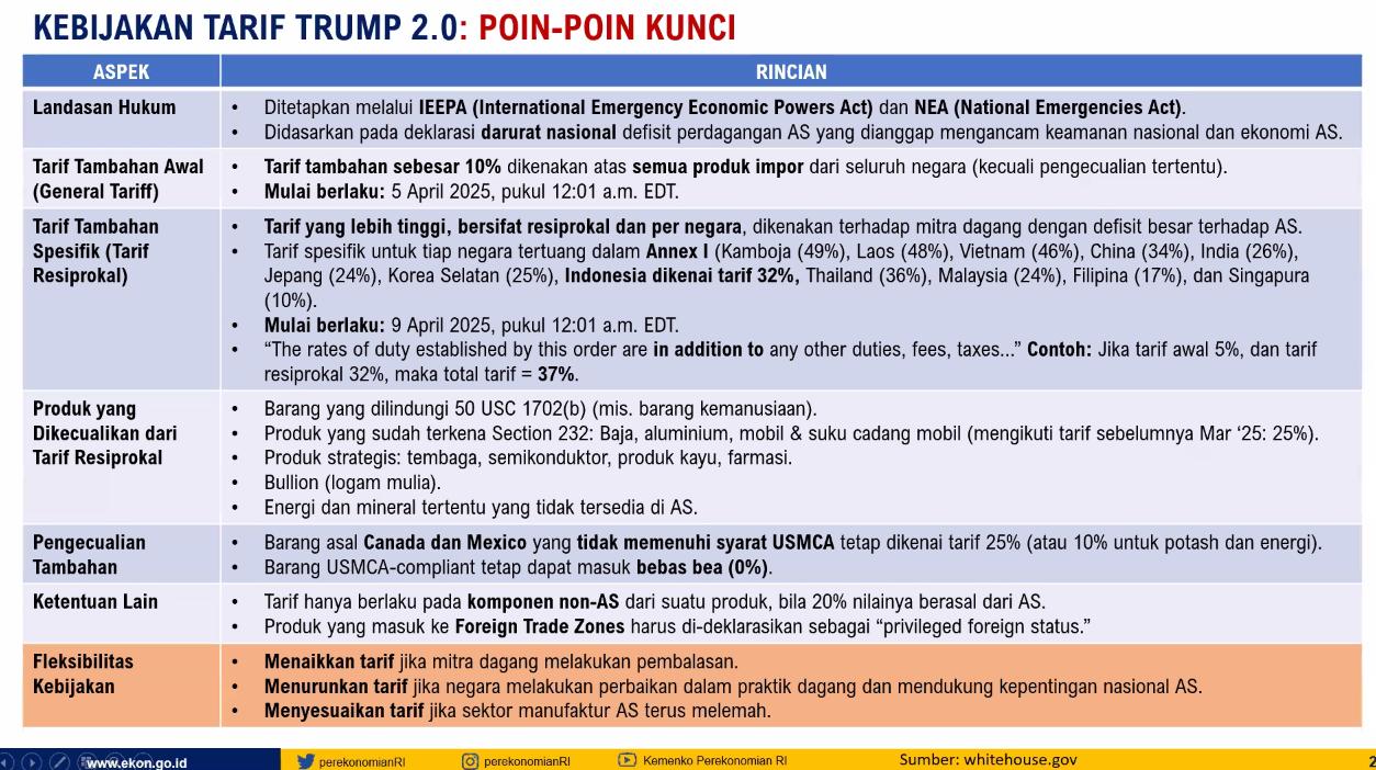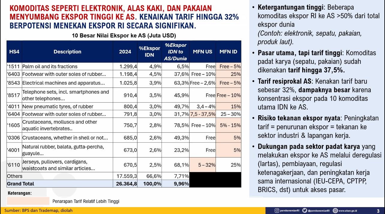 Dia menjelaskan, Pemerintah juga mencermati potensi dampak kebijakan tarif terhadap sejumlah sektor industri padat karya berorientasi ekspor, seperti industri apparel dan alas kaki.